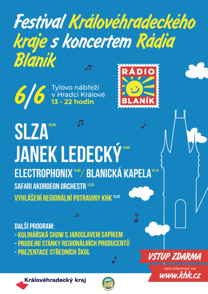 V pátek 6. června se na Tylově nábřeží v Hradci Králové se od 13. do 22. hodiny uskuteční Festival Královéhradeckého kraje. Návštěvníky čeká bohatá nabídka regionálních producentů, lahůdky z celého kraje a bohatý hudební program.