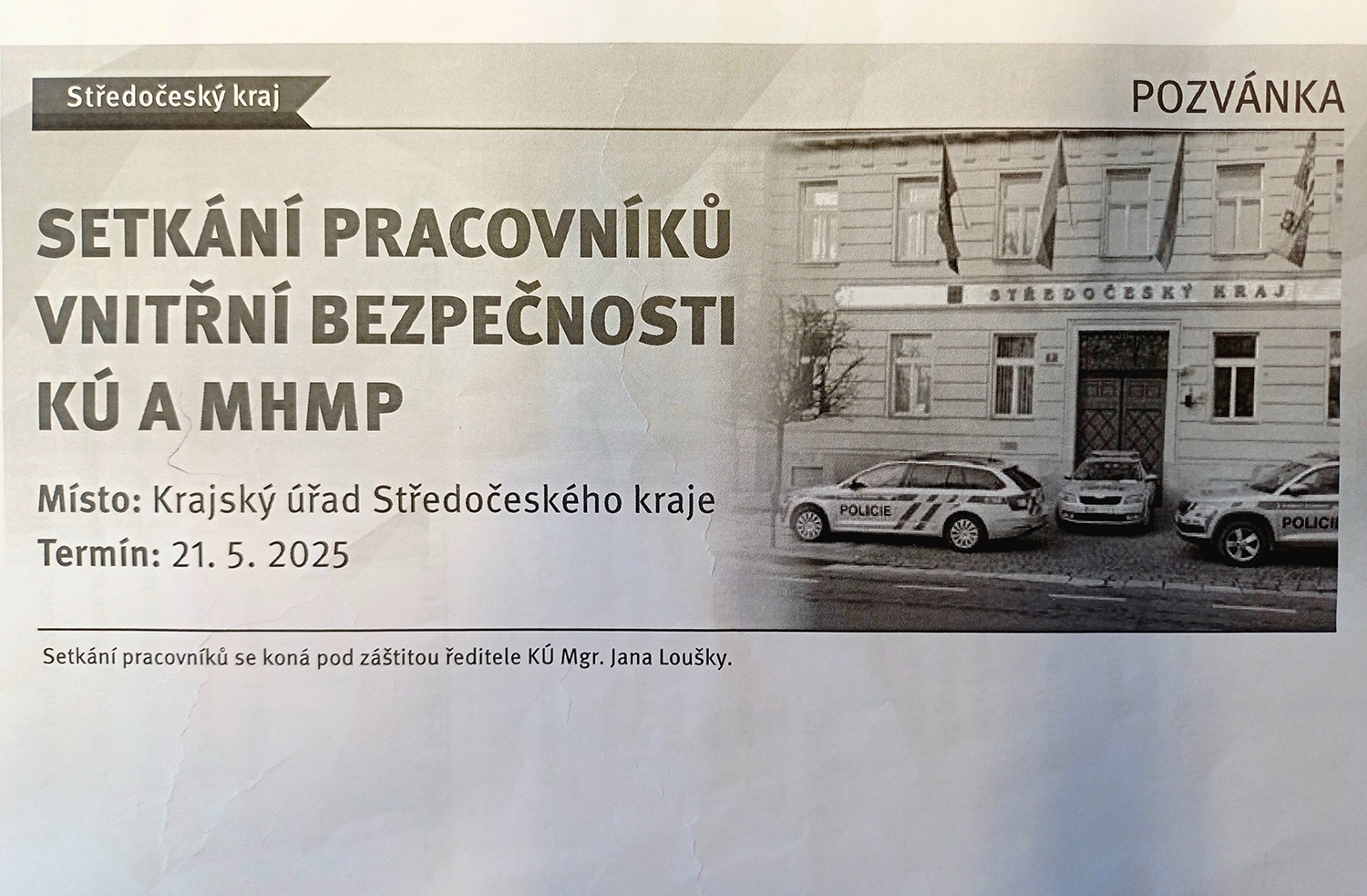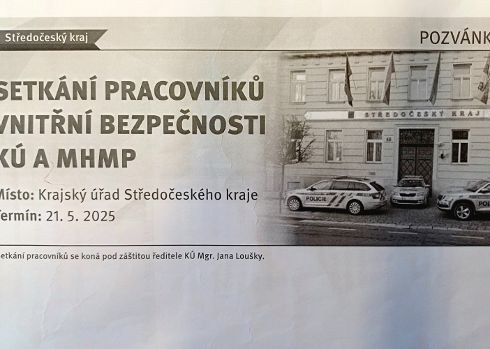 Pod organizačním vedením ředitele Krajského úřadu Středočeského kraje p. Mgr. Jana Loušky a vedoucího Odboru bezpečnosti a krizového řízení p. Mgr. Romana Svitáka se uskutečnilo setkání vedoucích pracovníků a odborných referentů, kteří zajišťují vnitřní bezpečnost budov krajských úřadů a MHMP. Předmětem tohoto setkání byly tři okruhy klíčových témat, se kterými byly účastníci seznámeni, dále pak předání aktuálních kontaktů a navázání spolupráce při zajišťování bezpečnosti na krajských úřadech a budovy MHMP.