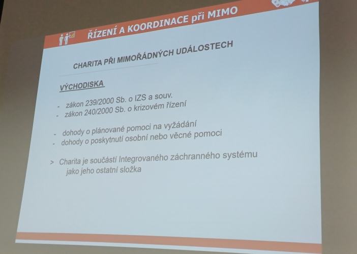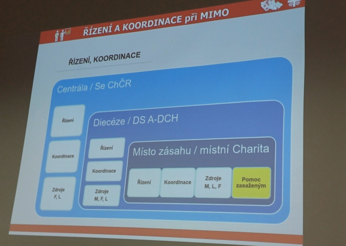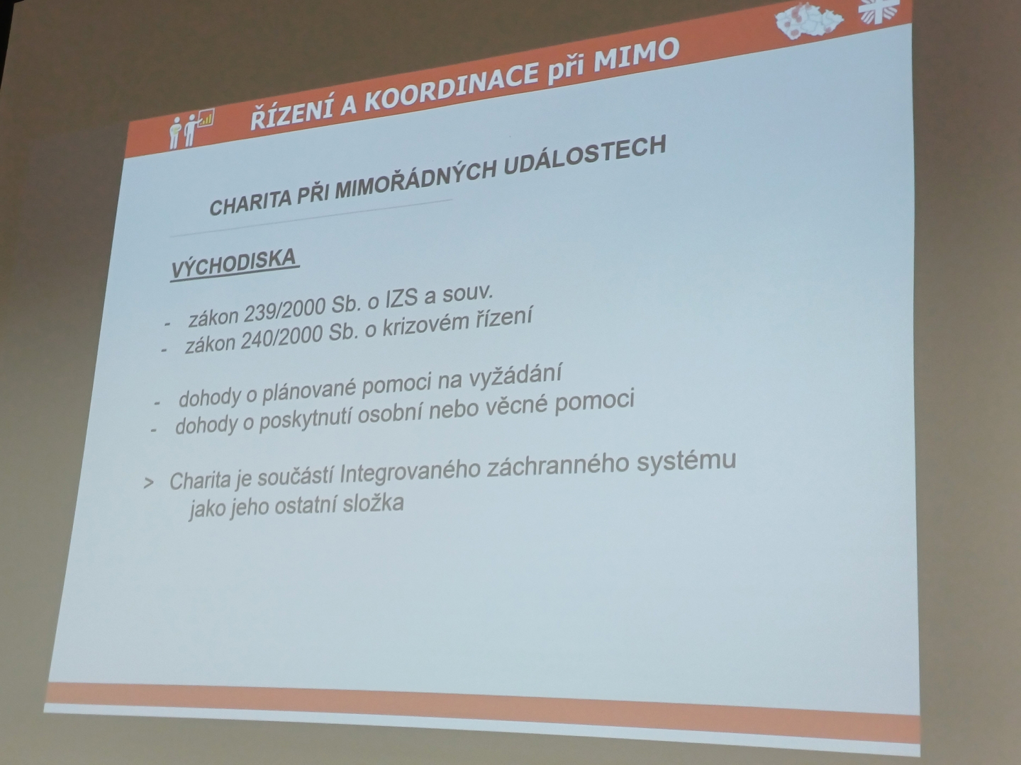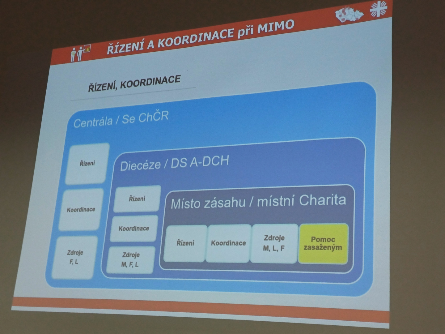 Úvodem byli přítomní zástupci složek IZS a neziskových organizací seznámeni s teritoriální působností DCHHK, která je odlišná od území Královéhradeckého kraje, neboť zasahuje do 5 krajů. Následovně vysvětlil organizační strukturu DCHHK, včetně jejího začlenění na národní úrovni (CHČR) a mezinárodní úrovni (Charitas Europa, Charitas Internationalis).