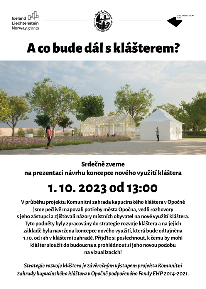 Královéhradecký kraj a architekti ateliéru City Upgrade představí výsledek diskuzí vedení města Opočna, místních obyvatel a kraje o oživení budovy kapucínského kláštera. V nedávno zpřístupněných zahradách v areálu kláštera se v neděli od 13 hodin zájemci seznámí s vytvořenou strategií jeho dalšího rozvoje a návrhem koncepce pro jeho nové využití. Následně další návrhy možného využití představí i studenti z FA ČVUT v Praze a FA VUT v Brně.