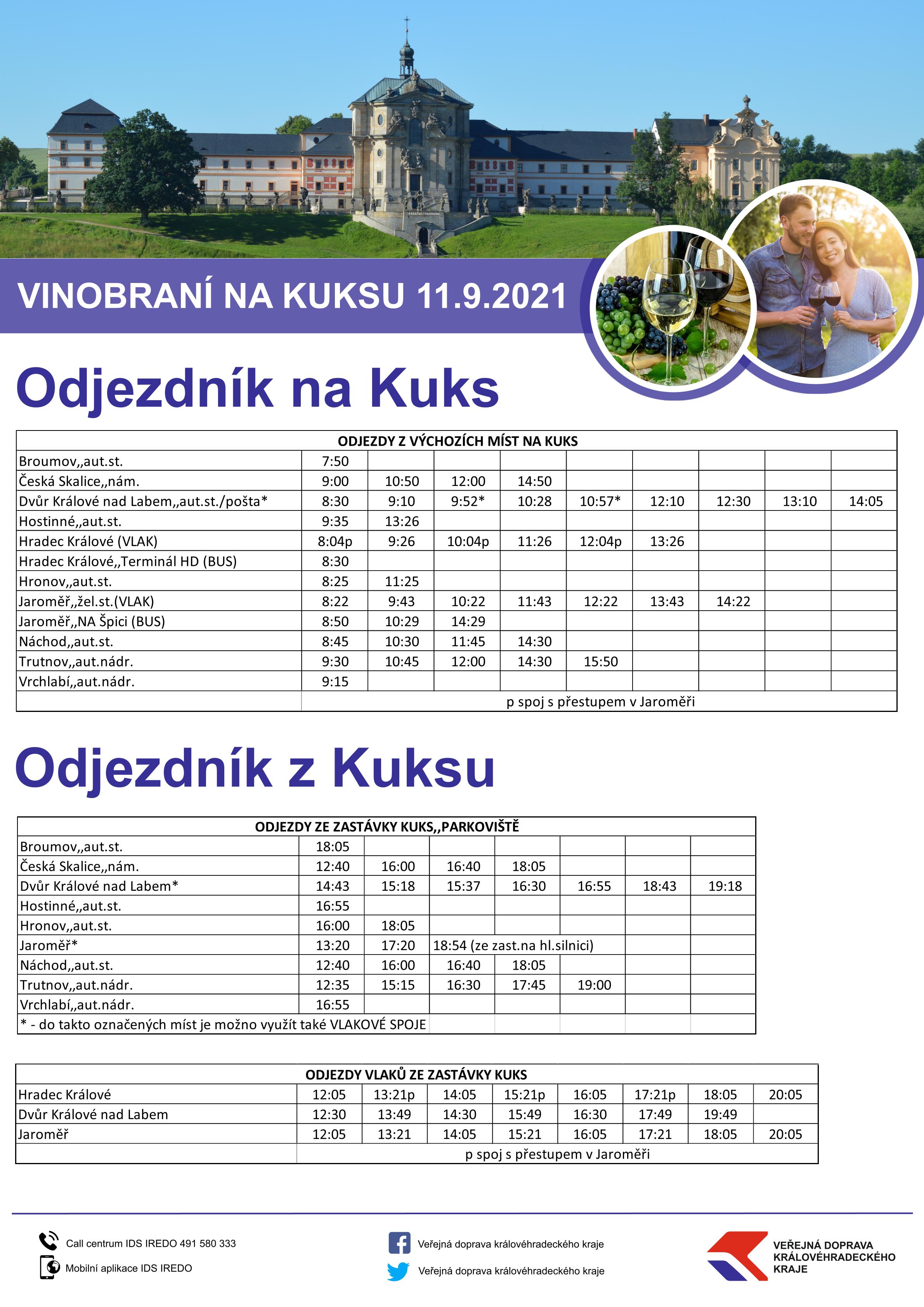 V sobotu 11. září 2021 proběhnou, letos již po patnácté, tradiční slavnosti vína a burčáku na Kuksu. Královéhradecký kraj nabízí možnost dostat se na místo pohodlně veřejnou dopravou. Posílí autobusové i vlakové spoje.