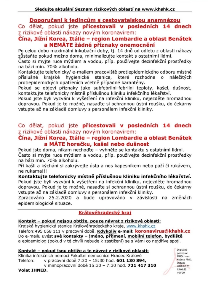 Vedle Číny je nově ve věci šíření korovaniru prohlášena za rizikovou oblast severní Itálie - region Lombardie a Benátek. Ministerstvo zdravotnictví systematicky monitoruje situaci kolem koronaviru 2019-nCoV a je v úzkém spojení jak s Evropským střediskem pro prevenci a kontrolu nemocí (ECDC), tak i s experty ze Světové zdravotnické organizace (WHO). Níže zveřejňujeme souhrnné informace pro občany. V příloze najdete také dokument s doporučenými opatřeními, který vydala krajská hygienická stanice.