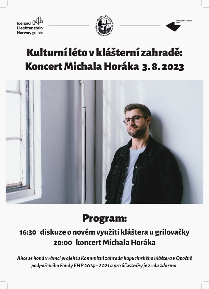 Program v klášterní zahradě se koná díky realizaci projektu Královéhradeckého kraje, Komunitní zahrada kapucínského kláštera v Opočně, za podpory Fondů EHP 2014–2021. Vstup na akci je pro návštěvníky zdarma.