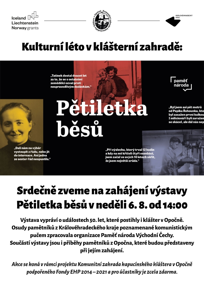 Veřejná diskuze se uskuteční před koncertem oblíbeného písničkáře Michala Horáka ve 20 hodin a na své si přijdou milovníci jeho osobitého humoru a hudby pro všechny generace. V průběhu odpoledne mohou zájemci zhlédnout výstavu o osudech pamětníků z Opočna i celého Královéhradeckého kraje. Výstavu připravila organizace Paměť národa Východní Čechy a v zahradě zůstane k vidění do začátku září.