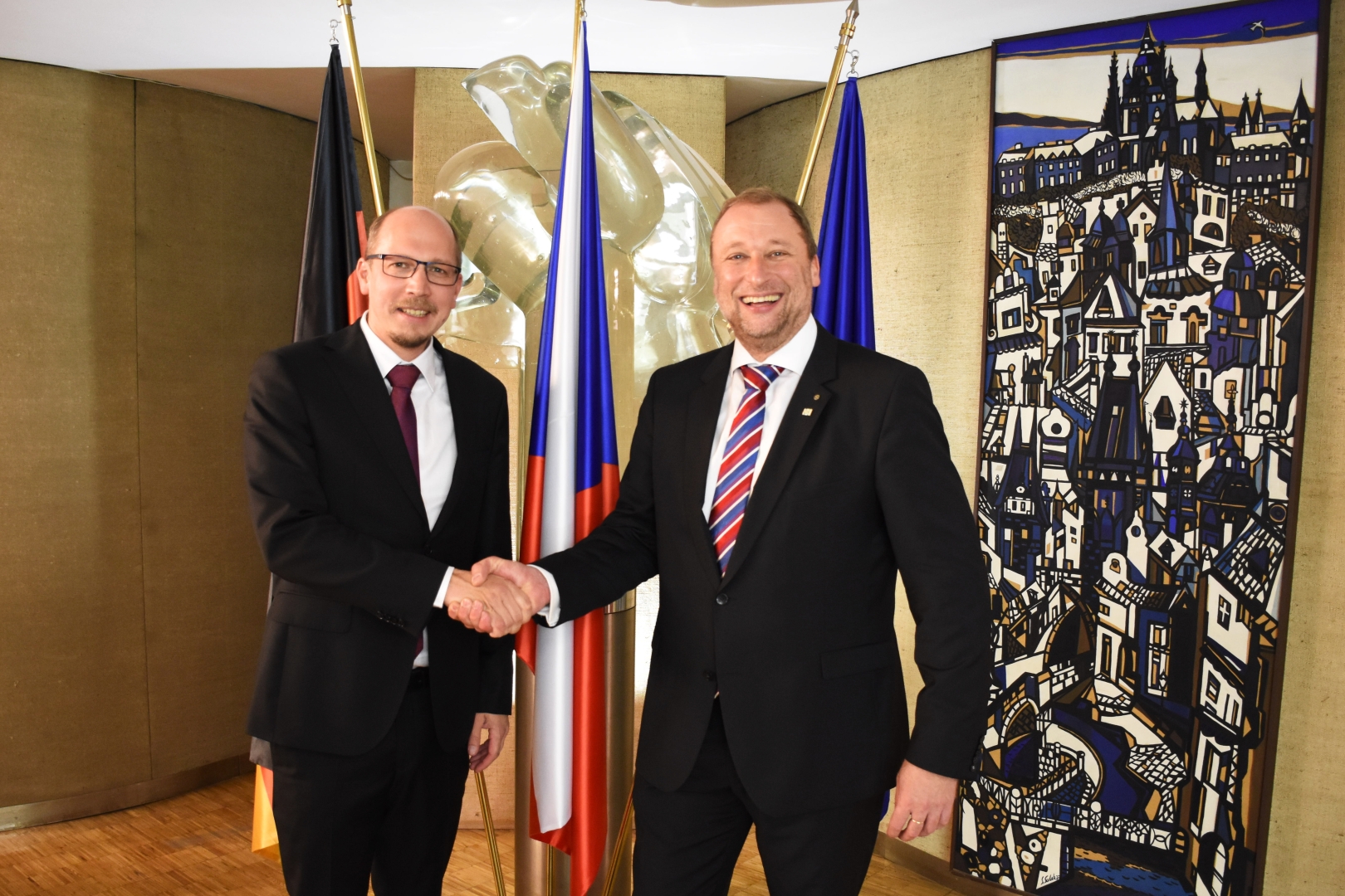 V rámci oslav královéhradecký hejtman pohovořil s velvyslancem ČR v Německu Tomášem Janem Podivínským o možnostech spolupráce a využití zázemí velvyslanectví pro rozvoj a podporu začínajících firem, regionálních výrobců a zprostředkování ukázek tradičních řemesel směrem k německým sousedům.