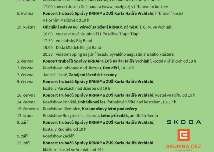 Správa Krkonošského národního parku od dubna realizuje v krkonošských městech nebo obcích zábavná odpoledne. Další se uskuteční 3. června v Janských Lázních, 24. června v Poniklé, 15. července v Jilemnici, 12. srpna v Rokytnici nad Jizerou a 9. září v Žacléři. Pro děti organizátoři připravili hry s krkonošskou a environmentální tematikou. Veškeré informace k akcím zájemci najdou na webu www.krnap.cz.