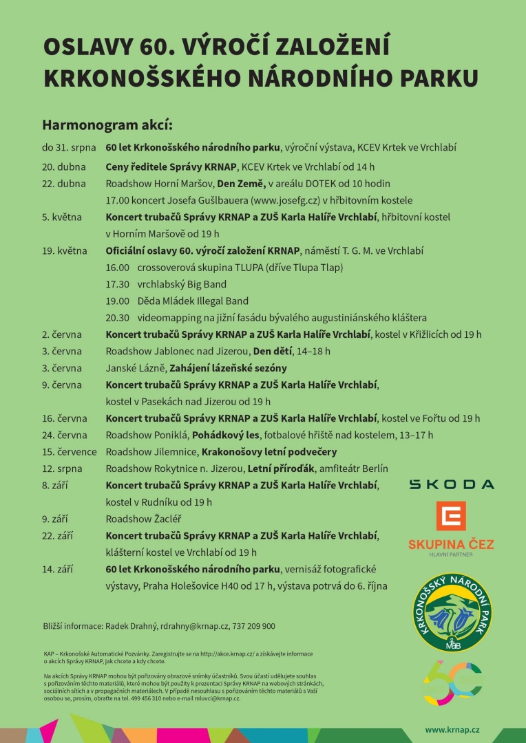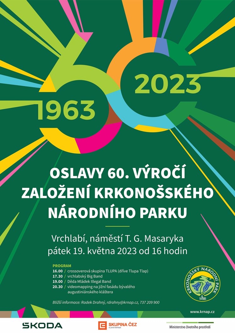 Hlavní akci k 60. výročí Správa KRNAP naplánovala na pátek 19. května ve Vrchlabí. Na Náměstí T. G. Masaryka se uskuteční tři koncerty a vyvrcholením akce bude večerní videomapping na jižní fasádu bývalého augustiniánského kláštera. Oslavy začínají v 16 hodin koncertem crossoverové skupiny Tlupa.