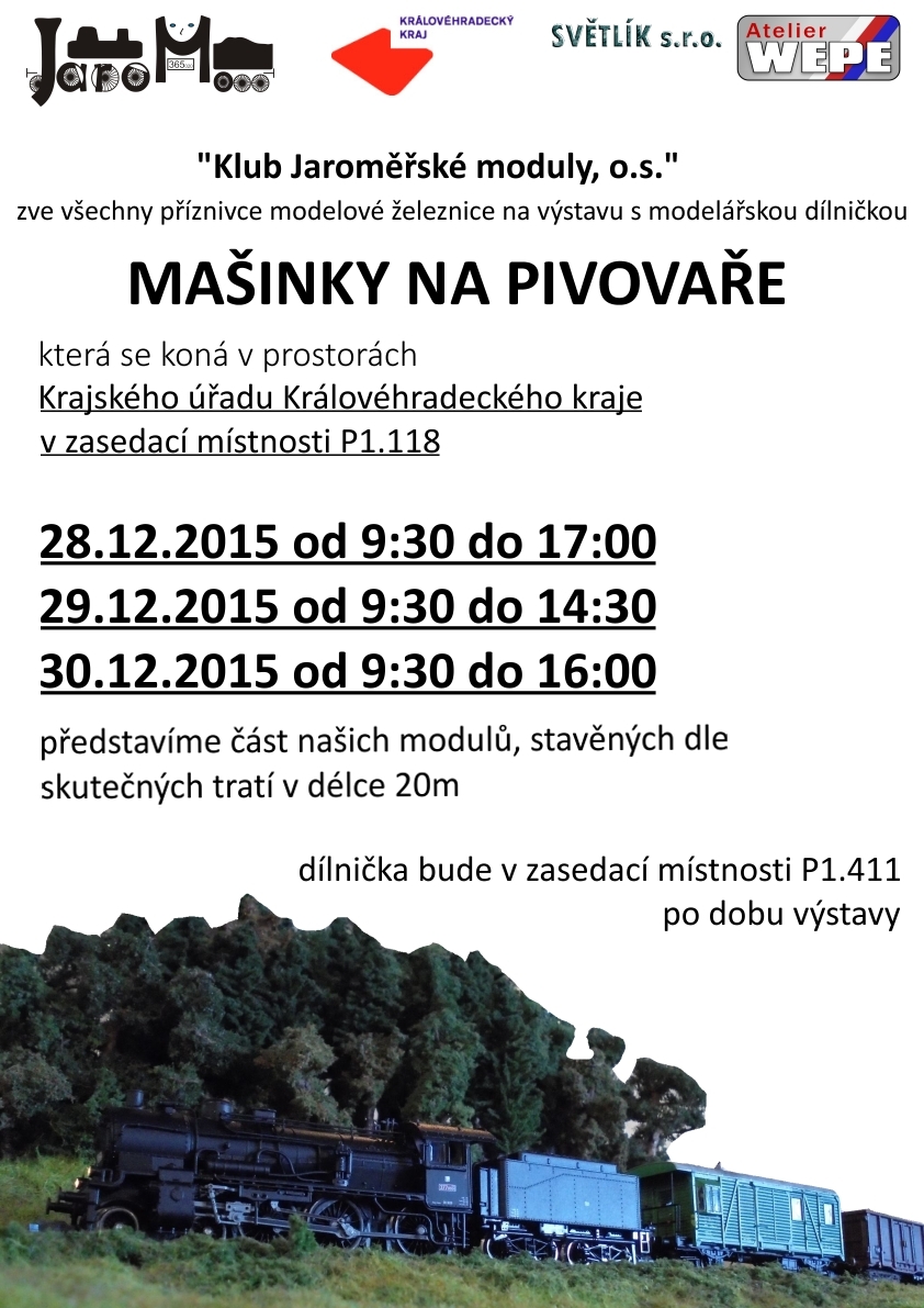Období mezi vánočními svátky zpestří zaměstnancům a návštěvníkům Krajského úřadu výstava modelové železnice. Ve dnech 28. - 30. 12. ji pořádá "Klub Jaroměřské moduly, o.s.". Mašinkám bude věnována místnost P1.118. V P1.411 zájemci naleznou modelářskou dílničku.