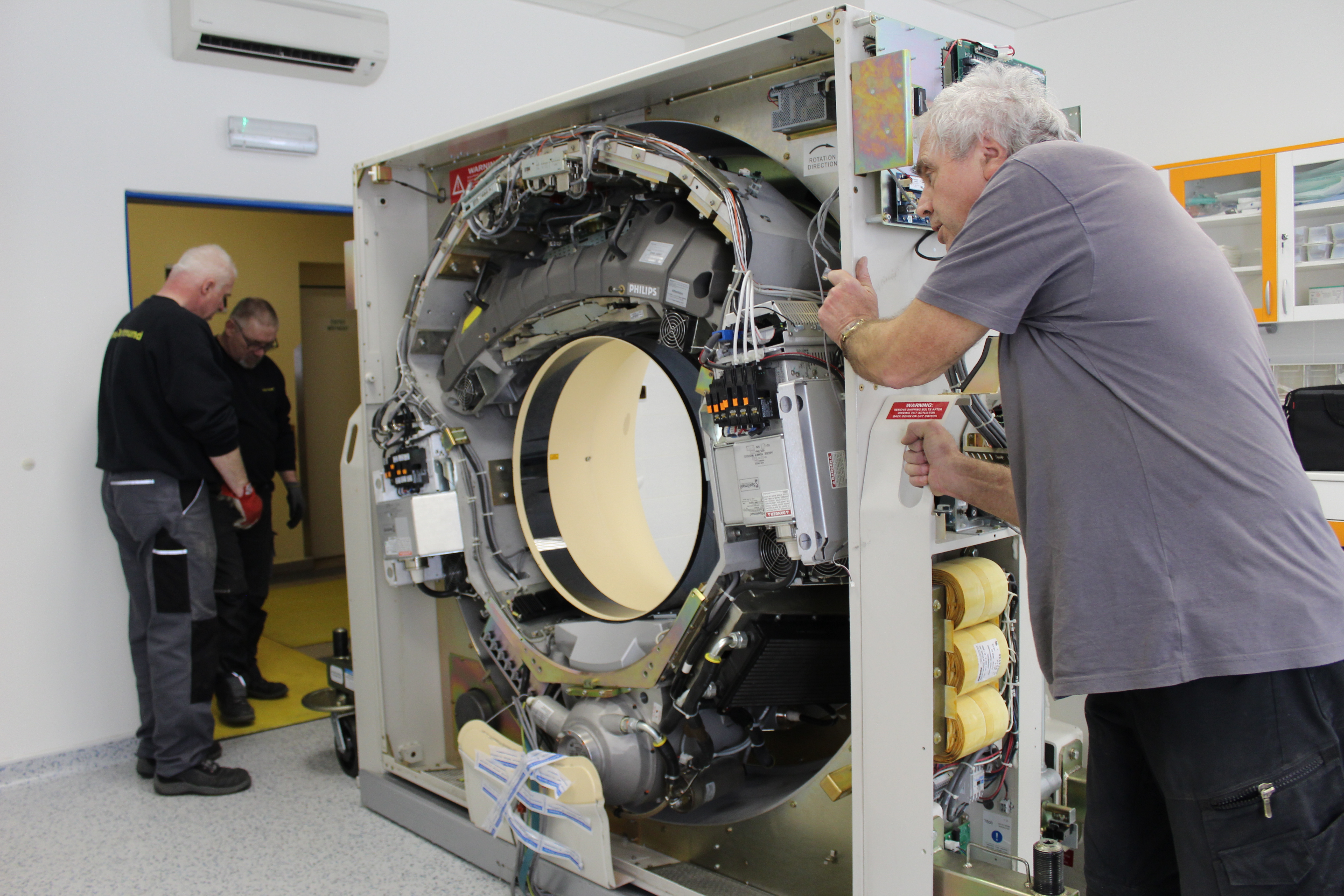 Nový přístroj výpočetní tomografie v těchto dnech instalují techničtí pracovníci na oddělení radiodiagnostiky Městské nemocnice Dvůr Králové nad Labem. Moderní CT, které nahradilo více než deset let staré zařízení, nabízí podrobnější snímky a méně rentgenového záření.