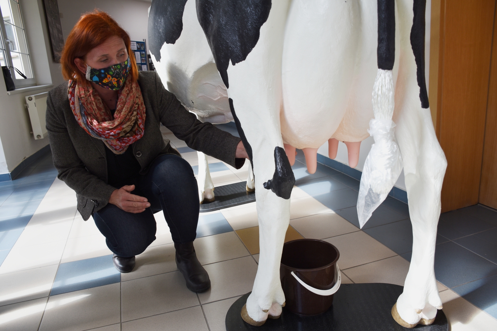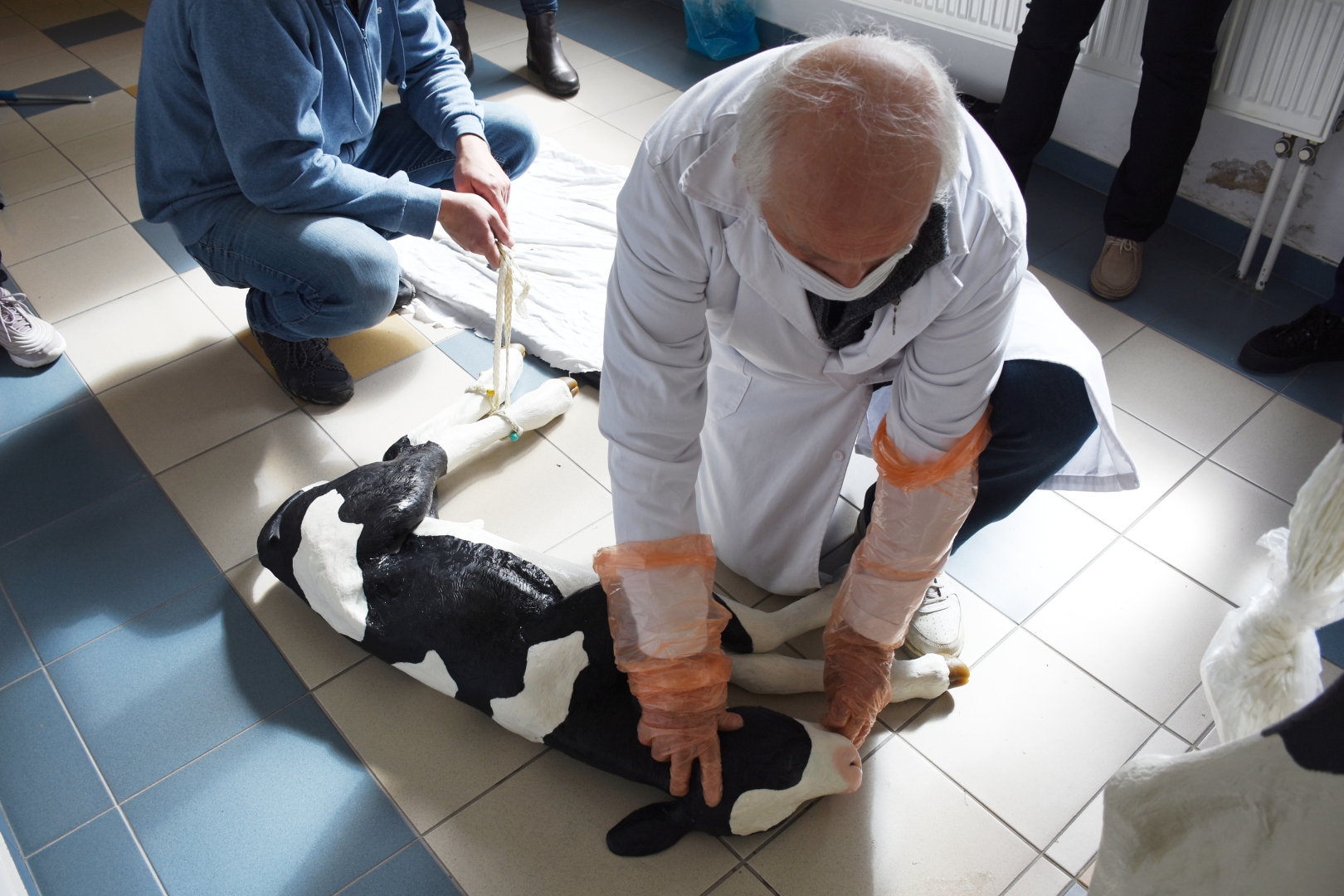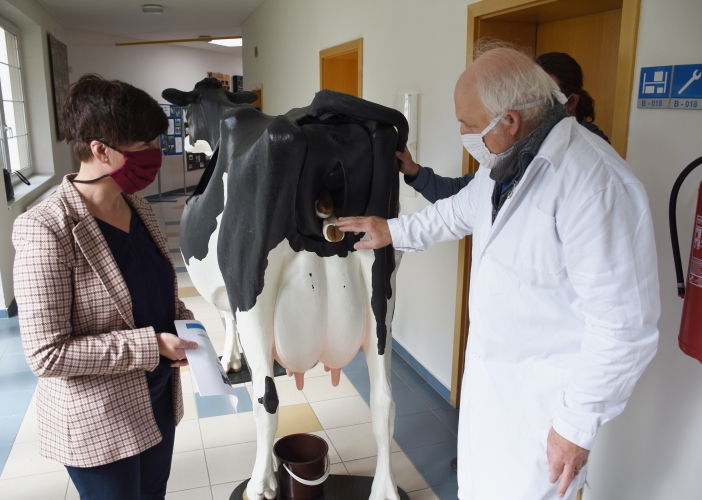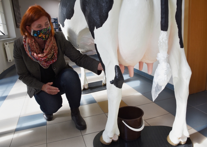 Středoškoláci nacvičují na modelu porod telete a seznamují se tak s možnými porodními polohami. Narozené tele má pohyblivou kostru a váží přibližně 35 kilogramů. Model krávy také žákům umožňuje i nácvik ručního dojení.