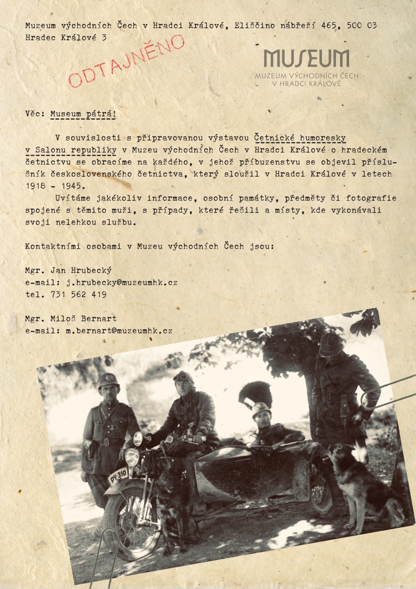 Muzeum východních Čech v Hradci Králové připravuje výstavu Četnické humoresky v Salonu republiky, kterou chce věnovat hradeckému četnictvu. Z tohoto důvodu se obrací na každého, v jehož příbuzenstvu se objevil příslušník československého četnictva sloužící v Hradci Králové v letech 1918 až 1945.