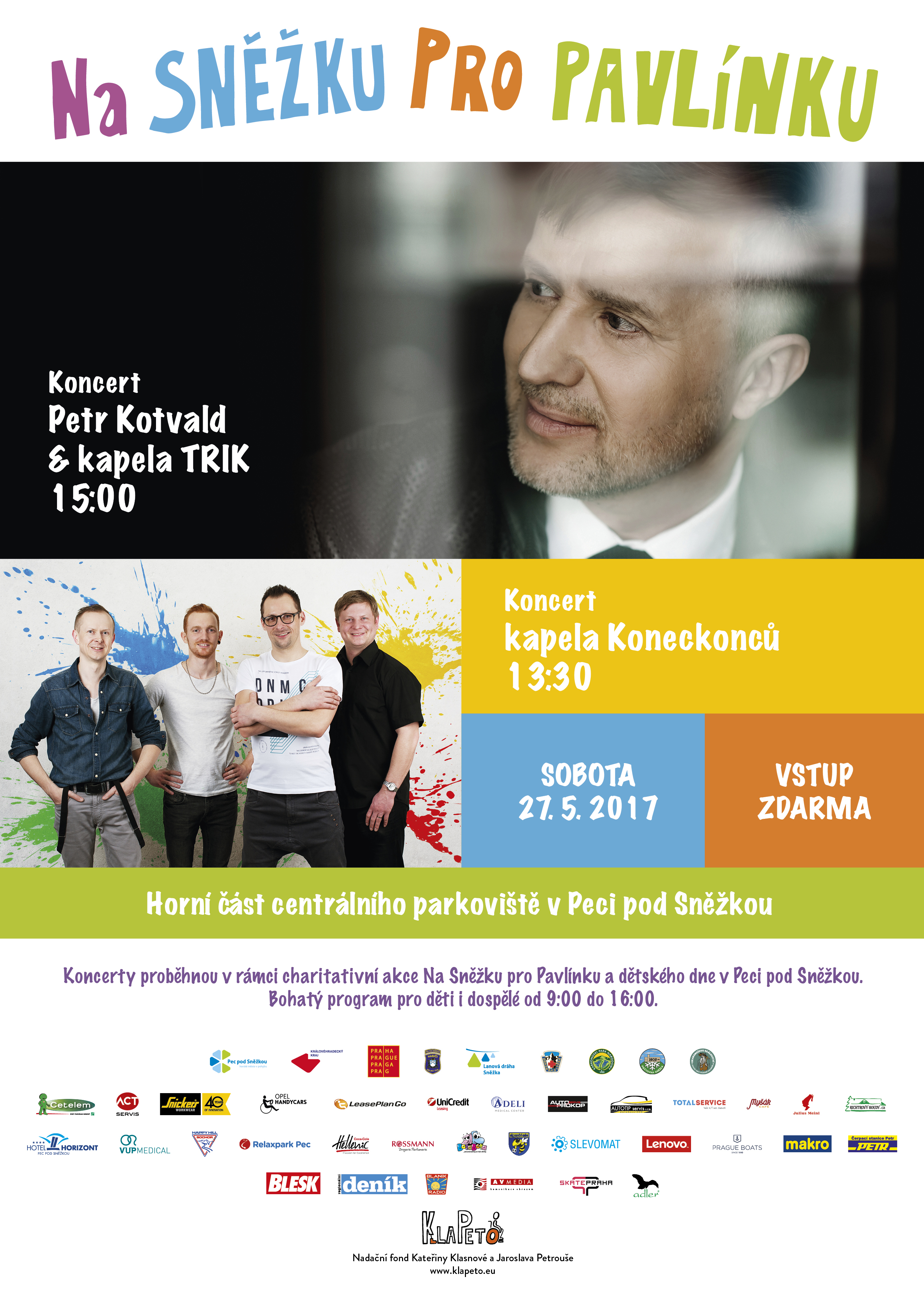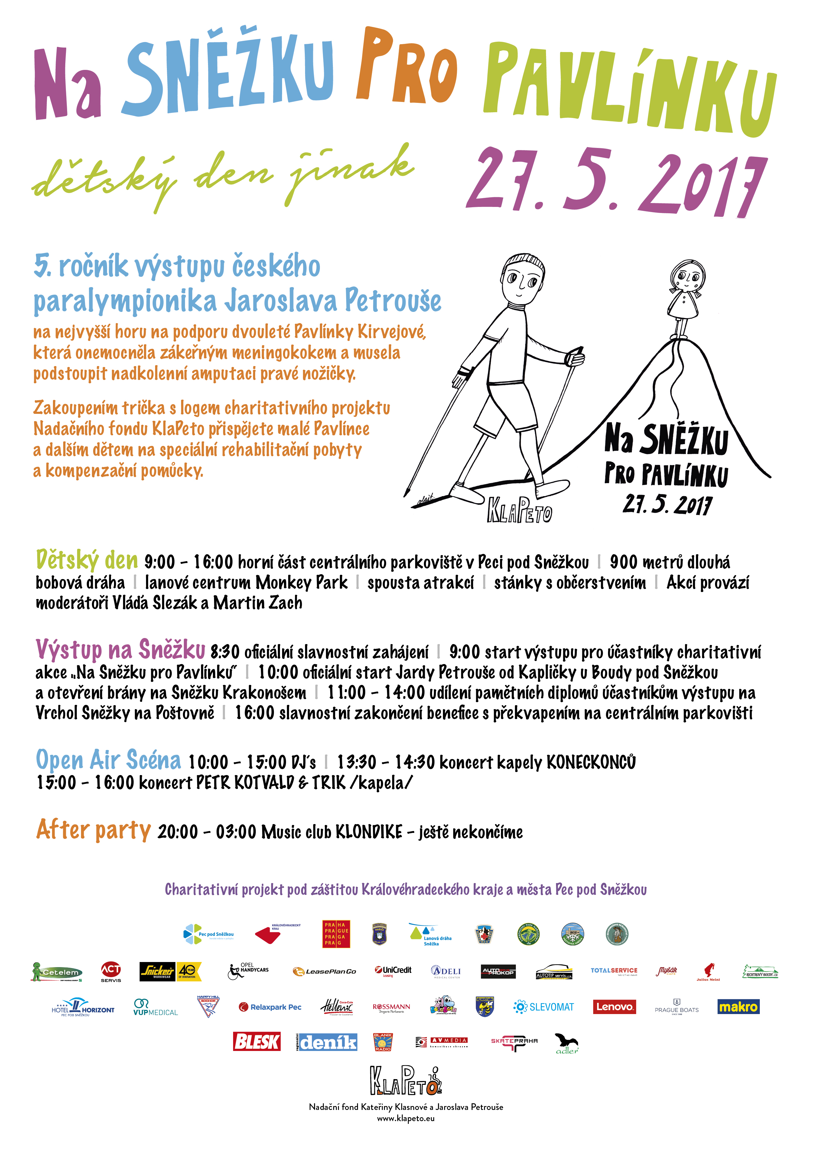Jubilejní pátý ročník charitativního výstupu na Sněžku, který pořádá Nadační fond KlaPeto, se uskuteční v sobotu 27. května v Peci pod Sněžkou. Letos se akce bude konat pro dvouletou Pavlínku Josiekovou z Karviné, která v sedmi měsících onemocněla zákeřným meningokokem. Svůj boj o život vyhrála, ale nemoc postihla mozek i zrak a Pavlínce musela být amputována pravá nožička nad kolenem.