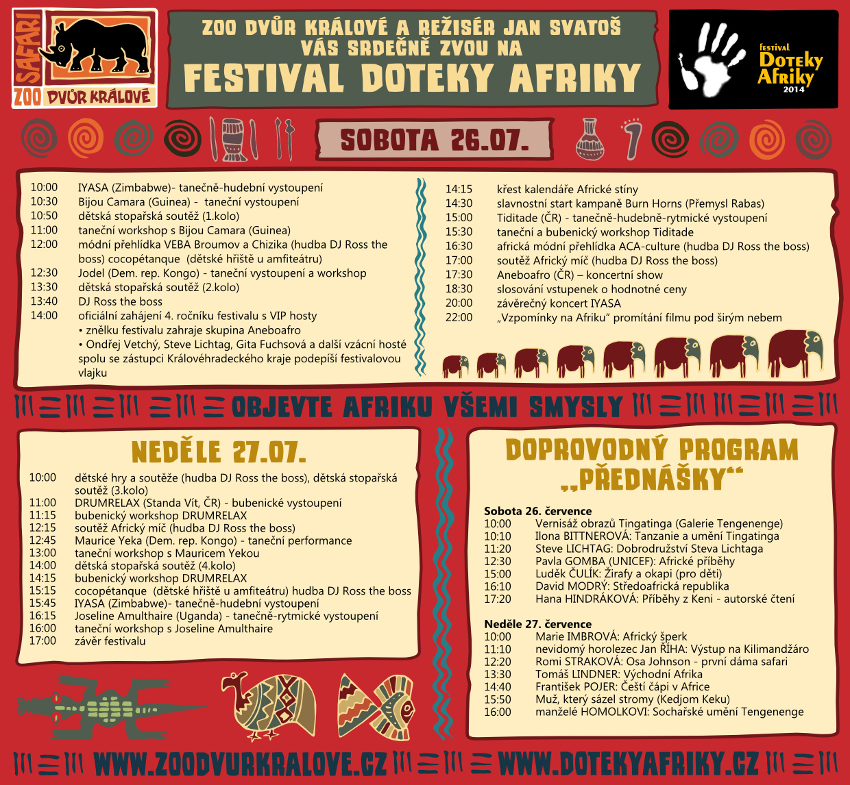 V sobotu dopoledne návštěvníky naladí hudebně-taneční vystoupení skupin ze Zimbabwe a Guinei. V poledne se uskuteční módní přehlídka společnosti Veba Broumov, která své produkty úspěšně vyváží právě na černý kontinent. Po ní bude následovat taneční vystoupení skupiny z Demokratické republiky Kongo. Ti nejmenší se mezitím zabaví při dětské stopařské soutěži. "Našlapaný" program bude pokračovat až do pozdních večerních hodin.