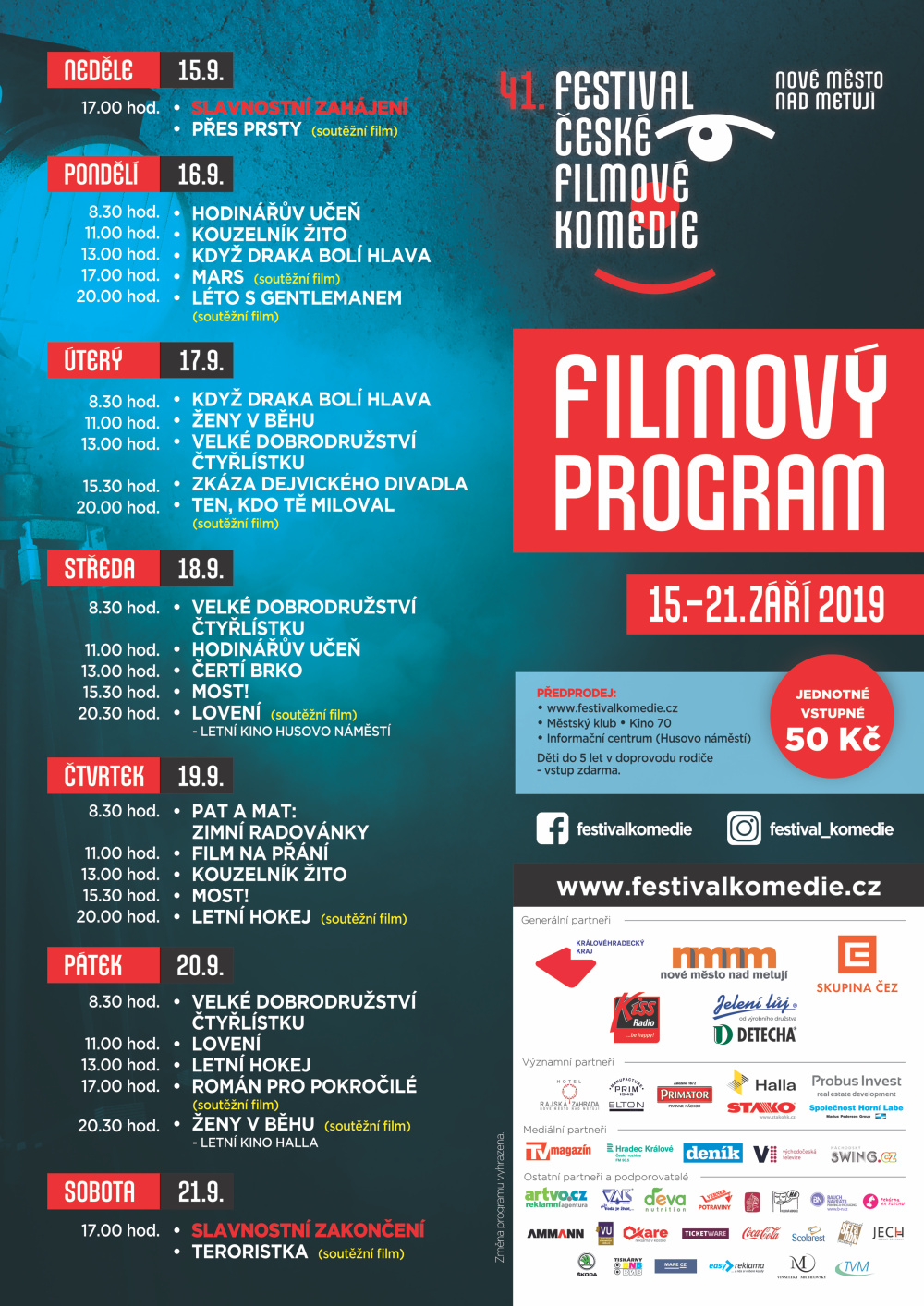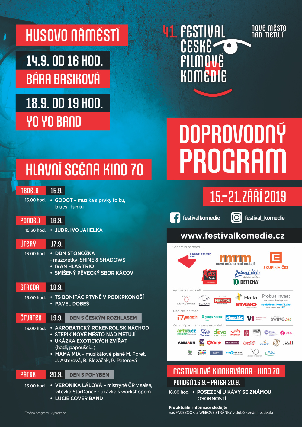 Nové Město nad Metují od neděle 15. září po dobu jednoho týdne ožije komediálním filmem. Uskuteční se tu 41. ročních Festivalu české filmové komedie. Festivalový program odstartuje již v sobotu od 16 hodin koncert Báry Basikové na Husově náměstí.