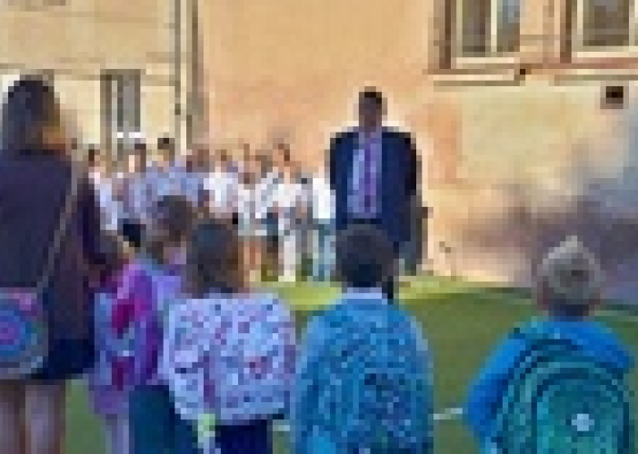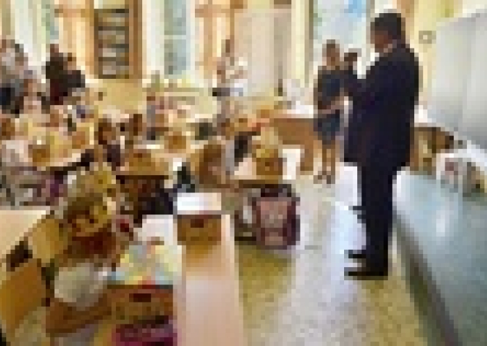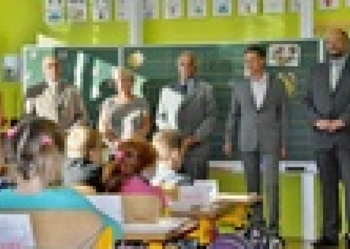 Hejtman Lubomír Franc a náměstci Otakar Ruml a Karel Janeček rozdávali v první školní den na základních školách Královéhradeckého kraje batůžky, které dostal každý žák nastupující do prvního ročníku.