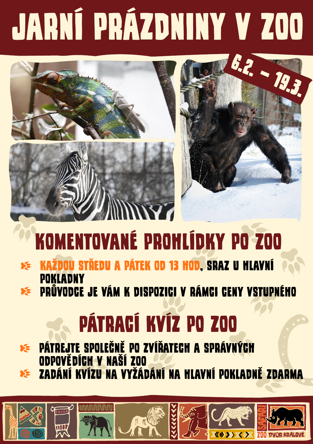 Na konec školního pololetí navazují jarní prázdniny. Každou středu a pátek od 6. února do 19. března se můžete těšit na komentované prohlídky po zahradě. A pokud do zoo zamíříte rovnou ze sjezdovky, určitě si uschovejte ski pasy. Po předložení permanentky Ski resortu Černá Hora-Pec či karet Harrachov Card a Rokytnice Card vás u pokladny po celou zimu čeká příjemná sleva na vstupné pro dospělého i pro dítě.