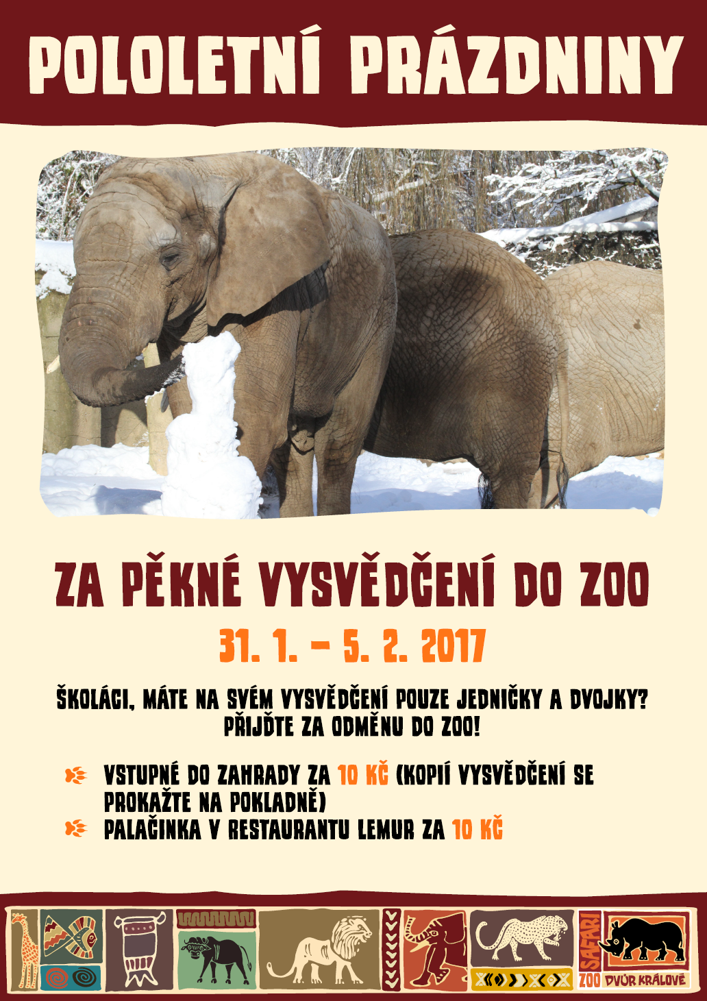 V období od 31. ledna do 5. února mají děti, které si s sebou do zoo přinesou vysvědčení, kde nebudou horší známky než jedničky a dvojky, vstup za symbolických deset korun. A to není vše. V Restaurantu Lemur si za pěkné vysvědčení mohou pochutnat na sladké pochoutce rovněž za 10 Kč.