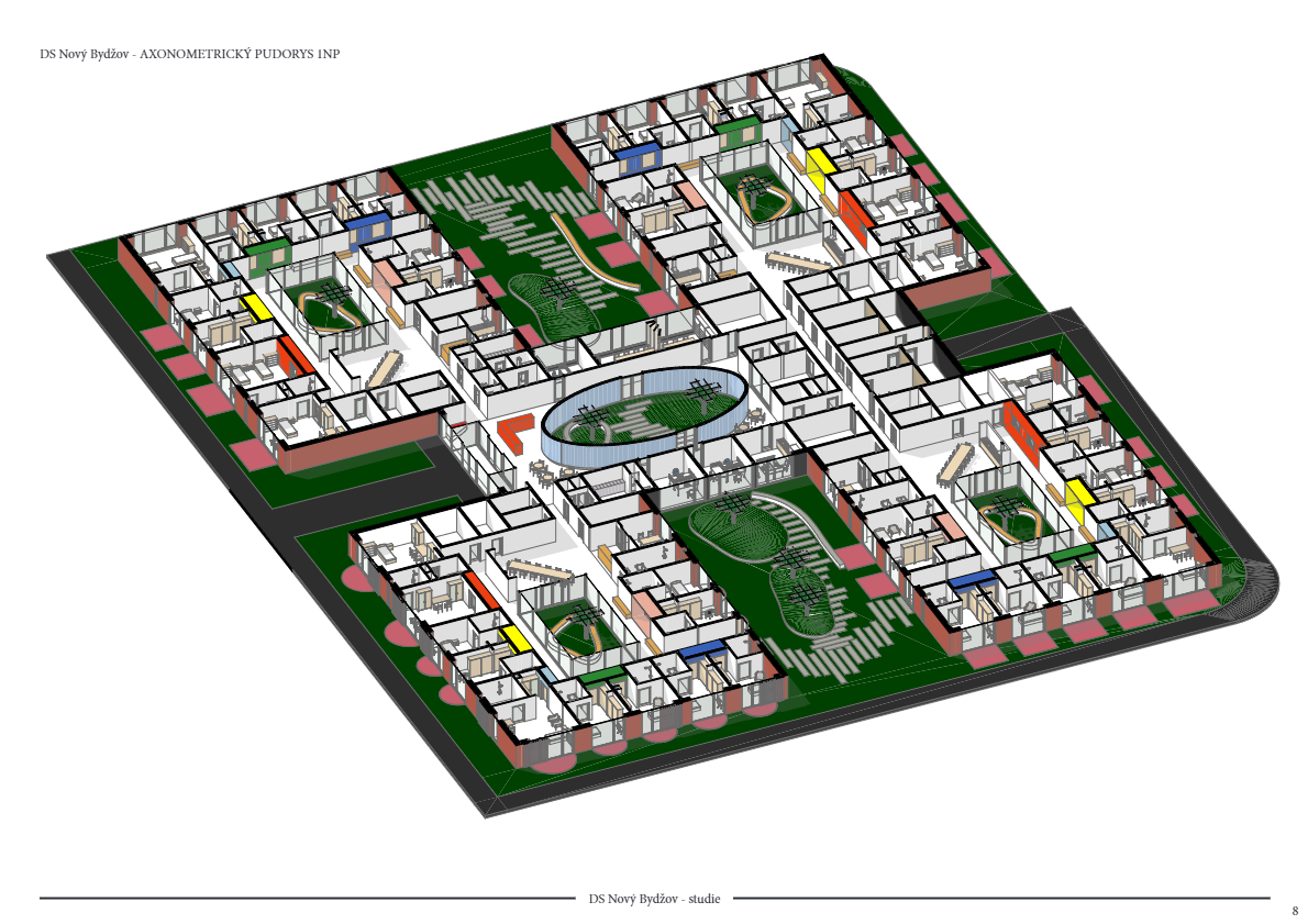 Součástí projektu je také kompletní venkovní zázemí se zelení. Pobyt na čerstvém vzduchu je totiž důležitý pro psychickou pohodu klientů a v rámci možností také pro udržování jejich celkově dobré kondice. Kromě zeleně a oplocení bude venkovní zázemí zahrnovat také chodníky a parkovací plochy.