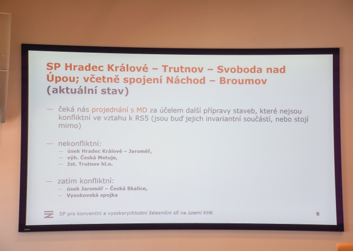 Zástupci Správy železnic seznámili členy dopravního výboru krajského zastupitelstva se záměry na rozvoj železniční infrastruktury v Královéhradeckém kraji. Jde především o možné úpravy konvenční trati Hradec Králové – Trutnov – Svoboda nad Úpou, včetně spojení na Náchod a Broumov a dále o výstavbu plánované vysokorychlostní trati RS5 z Prahy do Wroclawi.