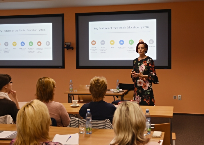 O své zkušenosti na téma Budování společných hodnot a kultury školy se na semináři podělila Viera Grohová, ředitelka popradské „nejjižnější finské školy“ ze Slovenska. Českým pedagogům představila, co a jak se v jejich škole učí a že je důležité vnímat školu jako živou komunitu, která má v centru své pozornosti rozvoj žáka i přínosnou spolupráci s rodiči.
