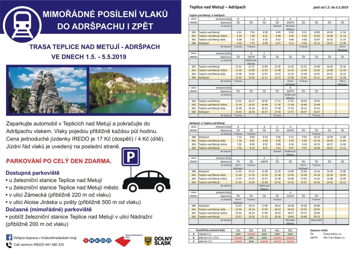 „Posílili jsme vlakové spoje mezi Teplicemi nad Metují a Adršpachem, které umožní turistům se pohodlně dostat z nově zřízených odstavných parkovišť v Teplicích do skalního města. Od 1. do 5. května pojedou spoje dvakrát do hodiny, a to v časovém rozmezí přibližně od 8:30 do 16:00. Posílení spojů pak bude pokračovat od 9. června do konce září, přičemž v září pojedou posílené vlaky jen o víkendech,“ uvedl Martin Červíček, první náměstek hejtmana odpovědný za oblast dopravy.
