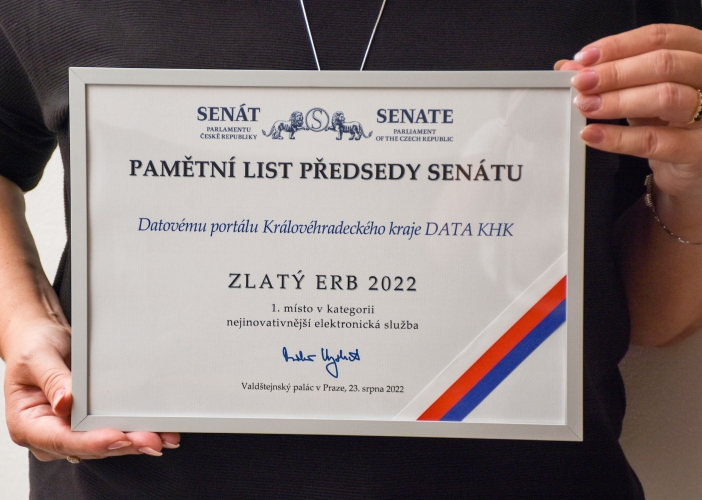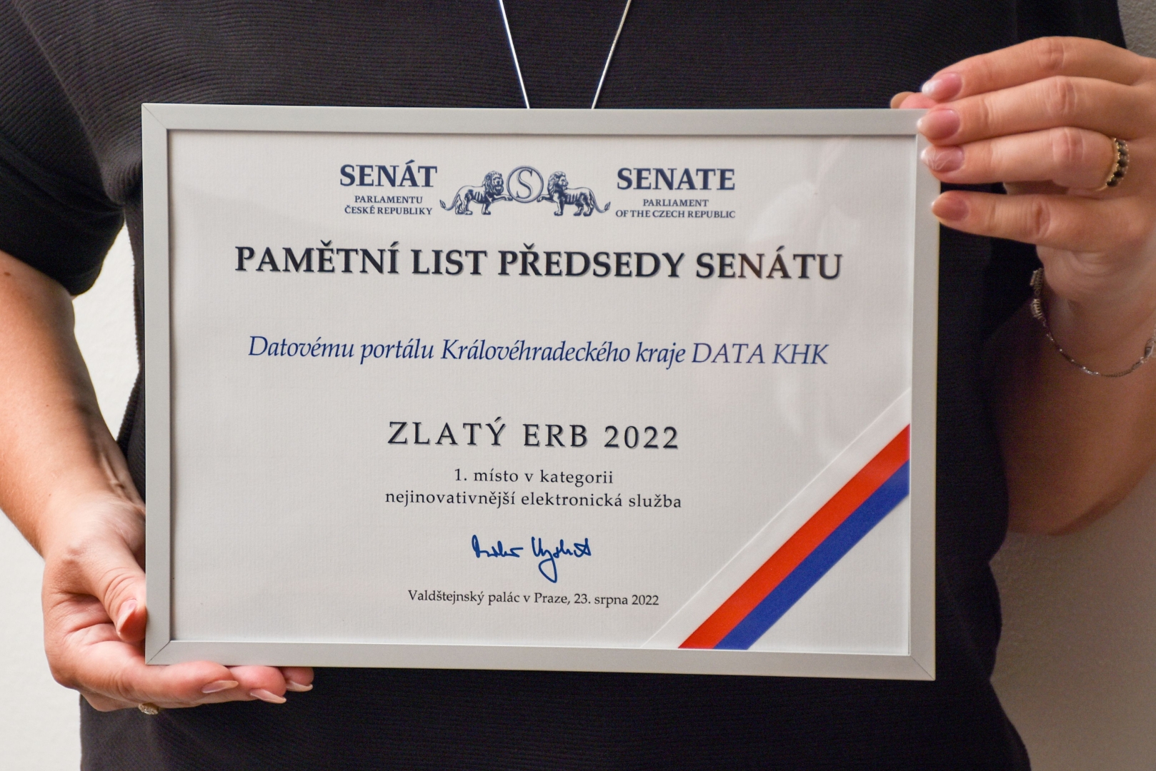 Ocenění v podobě pamětního listu za 1️. místo v soutěži Zlatý erb 2022 v kategorii Služby převzal za Královéhradecký kraj z rukou předsedy senátu Miloše Vystrčila ve Valdštejnském paláci náměstek pro oblast inovací, investic a informačních technologií Pavel Bulíček. Slavnostní předávání se uskutečnilo v Rytířském sále ve Valdštejnském paláci. Datový portál Data KHK je od května nejinovativnější elektronickou službou v republice.