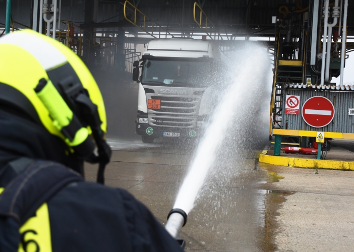 Krajské operační a informační středisko přijalo v pondělí po desáté dopoledne hlášení o požáru autocisterny v objektu výdejních lávek, přičemž mělo dojít při požáru ke zranění řidiče cisterny. Tak bylo rozehráno taktické cvičení složek IZS, které se s různými náměty koná v areálu skladu pohonných hmot v Cerekvici nad Bystřicí každé tři roky.