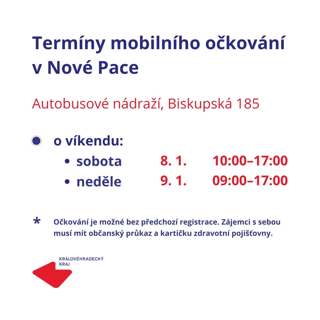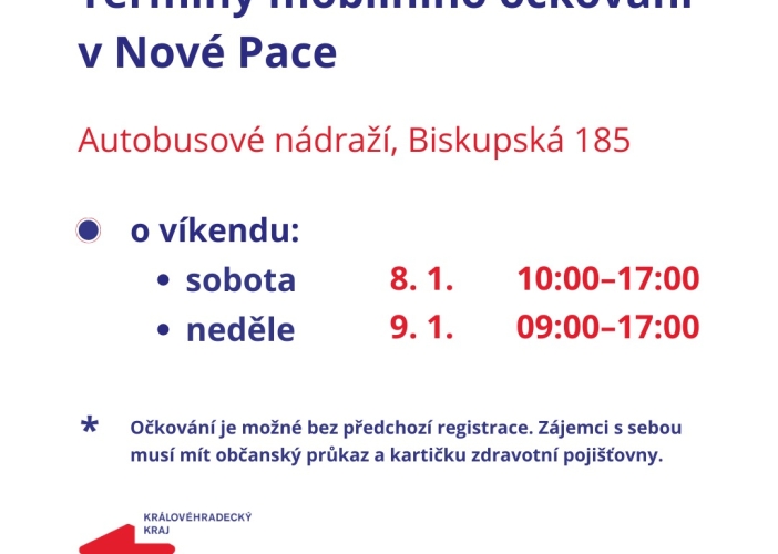 V hlavní budově autobusového nádraží v Nové Pace bude o víkendu 8. a 9. ledna očkovat mobilní očkovací tým. Zájemci budou moci přijít v sobotu mezi 10. a 17. hodinou a v neděli mezi 9. a 17. hodinou a nechat si aplikovat vakcínu proti covidu-19 bez předchozí registrace.