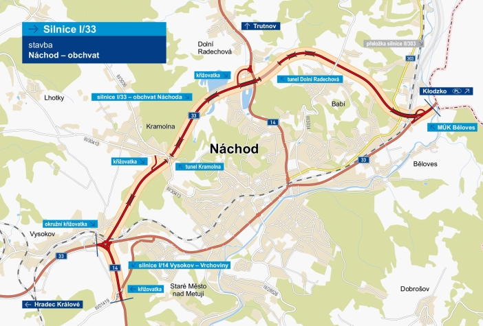 Ředitelství silnic a dálnic (ŘSD) začalo stavět 6,5 kilometru dlouhý obchvat Náchoda na silnici I/33 v Královéhradeckém kraji. Cena stavby, jejíž součástí budou i dva tunely, je 3,18 miliardy Kč bez DPH. Cílem stavby je vyvést z města tranzitní dopravu. Související paralelní stavbou bude přeložka silnice I/14 Vysokov–Vrchoviny. Řidiči by po obchvatu měli začít jezdit v prvním čtvrtletí roku 2028.
