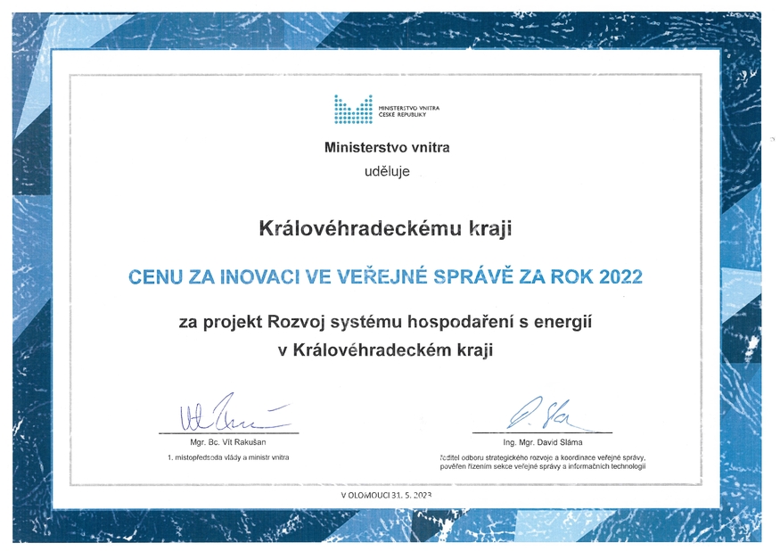 Ministerstvo vnitra ČR ocenilo projekt Královéhradeckého kraje zaměřený na zavedení dálkových odečtů energií. Cenu ministerstva vnitra za inovace ve veřejné zprávě cílené na zaměstnance převzal u příležitosti 7. ročníku konference Moderní veřejná správa 2023 náměstek Pavel Bulíček se svým realizačním týmem. Chytrý systém využívá kraj ve více jak stovce jeho nemovitostí.