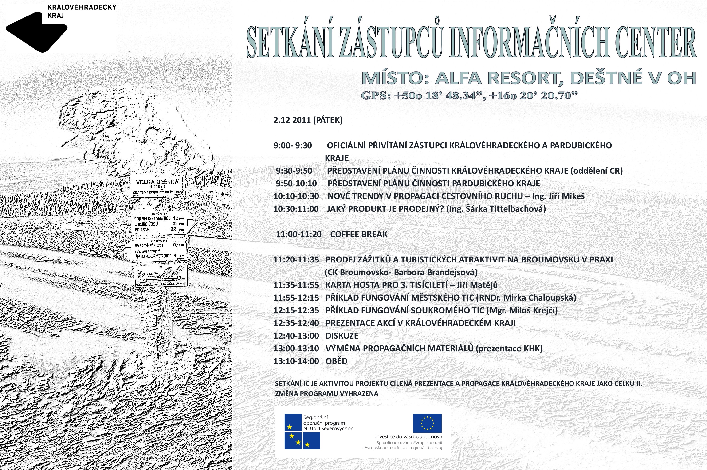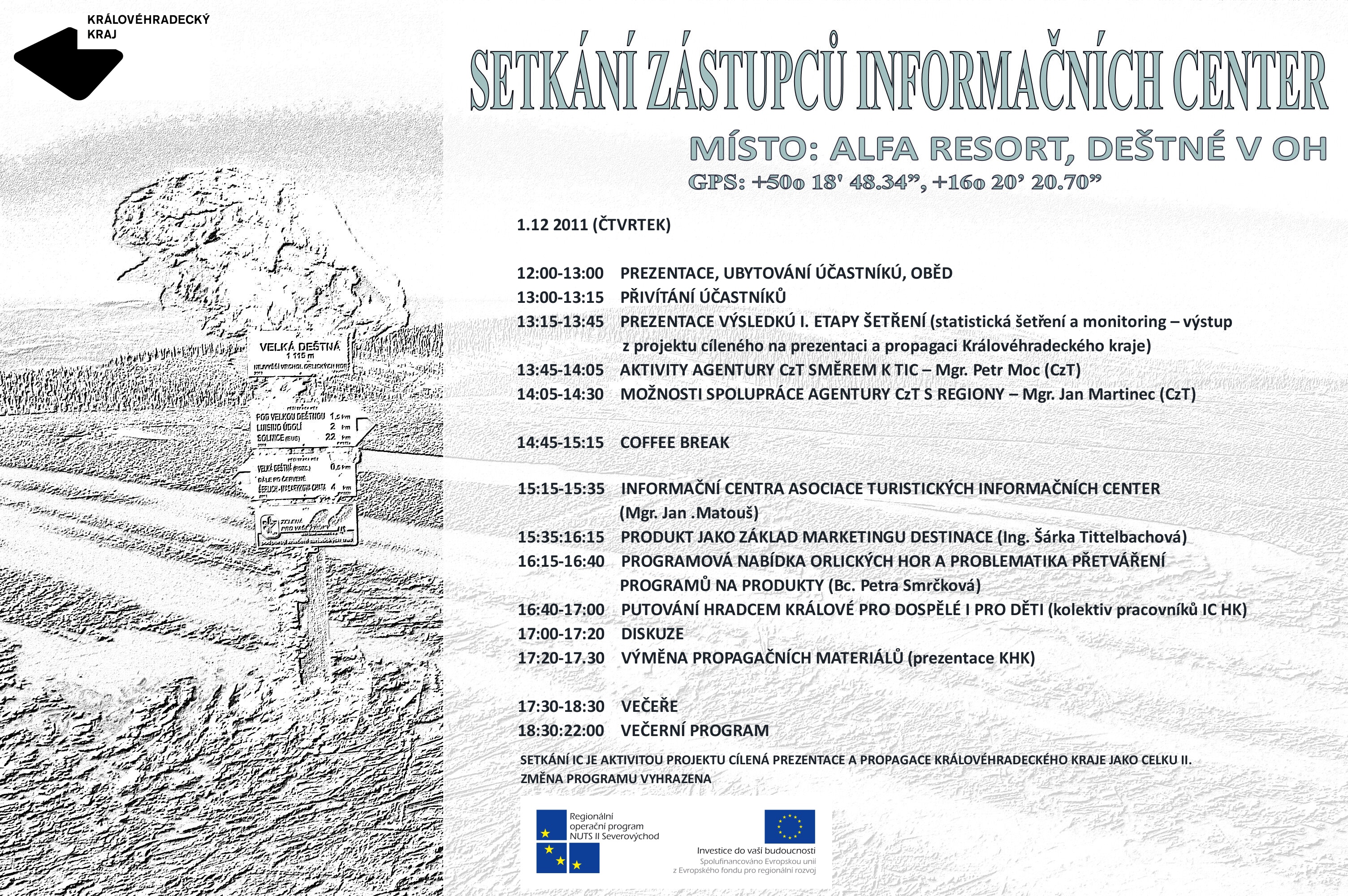 Ve dnech 1-2.12.2011 se v Deštném v Orlických horách uskuteční setkání zástupců turistických informační center. Pro účastníky je připraven bohatý program v podobě zajímavých prezentací s důrazem na propagaci Královéhradeckého kraje.