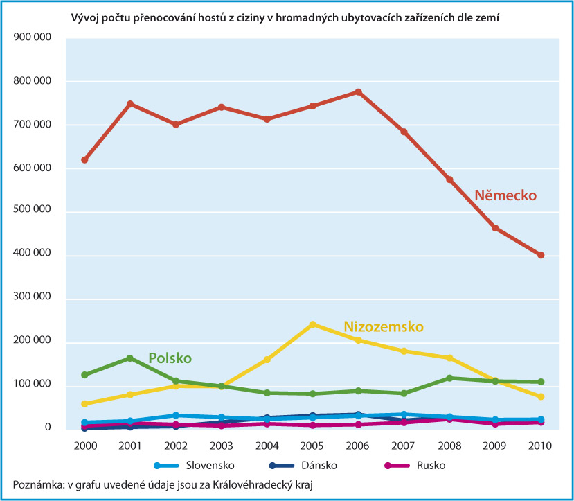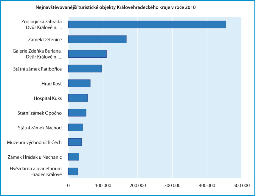 Statistika návštěvnosti Královéhradeckého kraje, využitelnost a kapacity ubytovacích zařízení dle turisticky významných území Královéhradeckého kraje, vývoj cen ubytování v kraji, přehled živnostenských oprávnění v oboru cestovního ruchu. Soubory ke stažení Vývoj počtu přenocování cizinců v HUZ v KHK v období 2000-2010 (219,5 KB, XLS) Vývoj počtu přenocování cizinců v HUZ v KHK v období 2000-2010 (142,39 KB, JPG) Nejnavštěvovanější turistické cíle v KHk v r.2010 (109,05 KB, JPG) Kongresy a konference (58 KB, XLS)