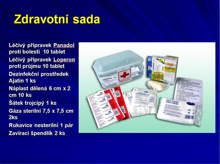 Zdravotní sada - obsah: Léčivý přípravek Loperon proti průjmu 10 tablet, Dezinfekční prostředek Ajatin 1 ks, Náplast dělená 6 cm x 2 cm 10 ks, Šátek trojcípý 1 ks Gáza sterilní 7,5 x 7,5 cm 2ks, Rukavice nesterilní 1 pár, Zavírací špendlík 2 ks