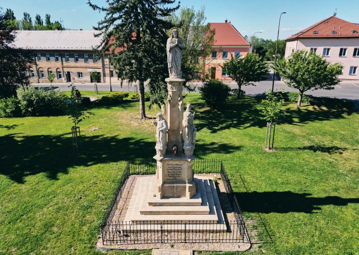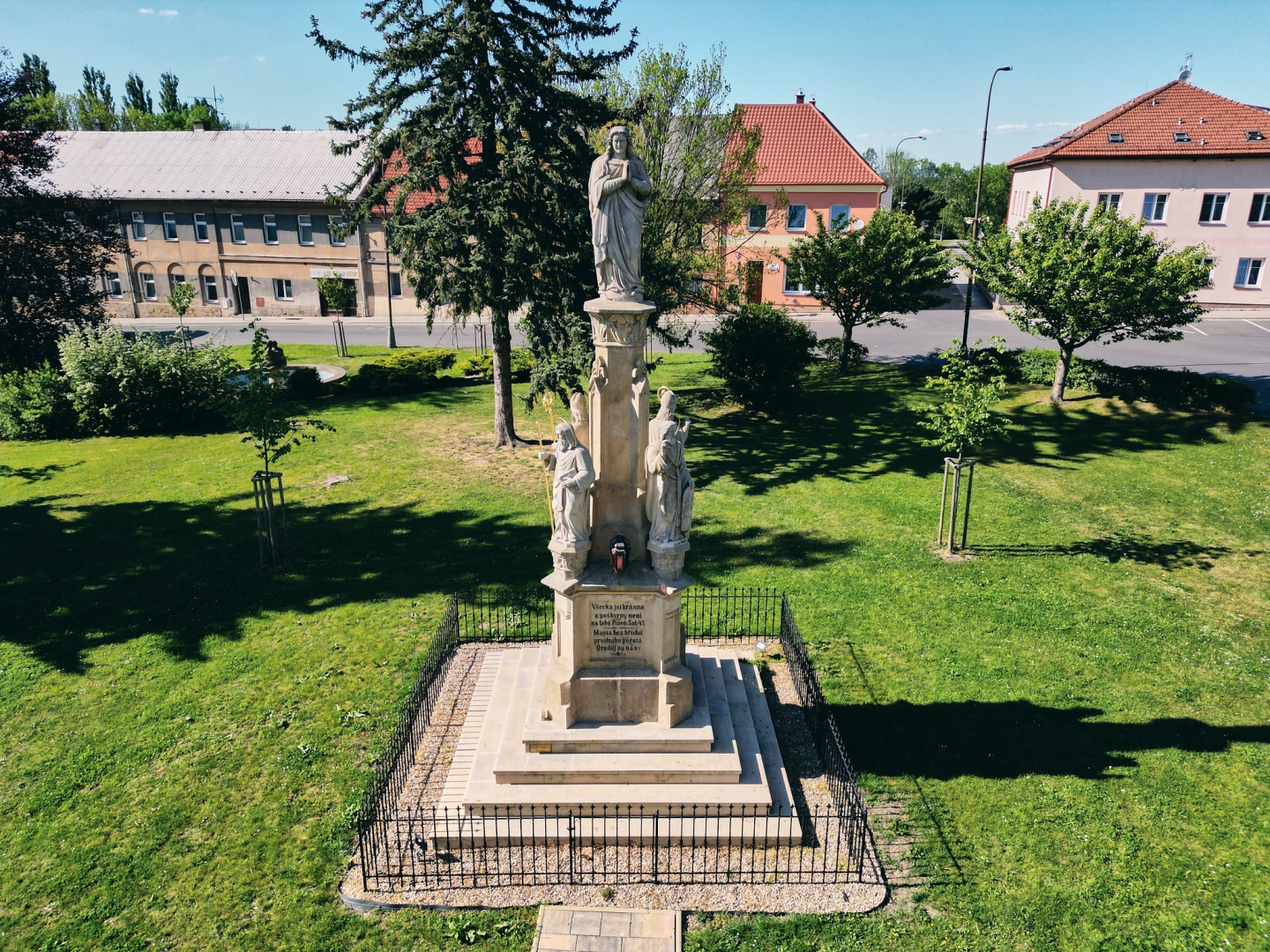 Mariánský sloup z roku 1869 na Mírovém náměstí byl po II. světové válce rozebrán a uložen do místního kostela. V 80. letech minulého století jej navzdory tehdejšímu režimu páter Koukal nechal znovu postavit vedle kostela, kde zůstal v poničeném stavu do roku 2021. Odborně restaurované sousoší bylo v tomtéž roce umístěno na své původní místo na náměstí a stalo se jeho hlavní dominantou.