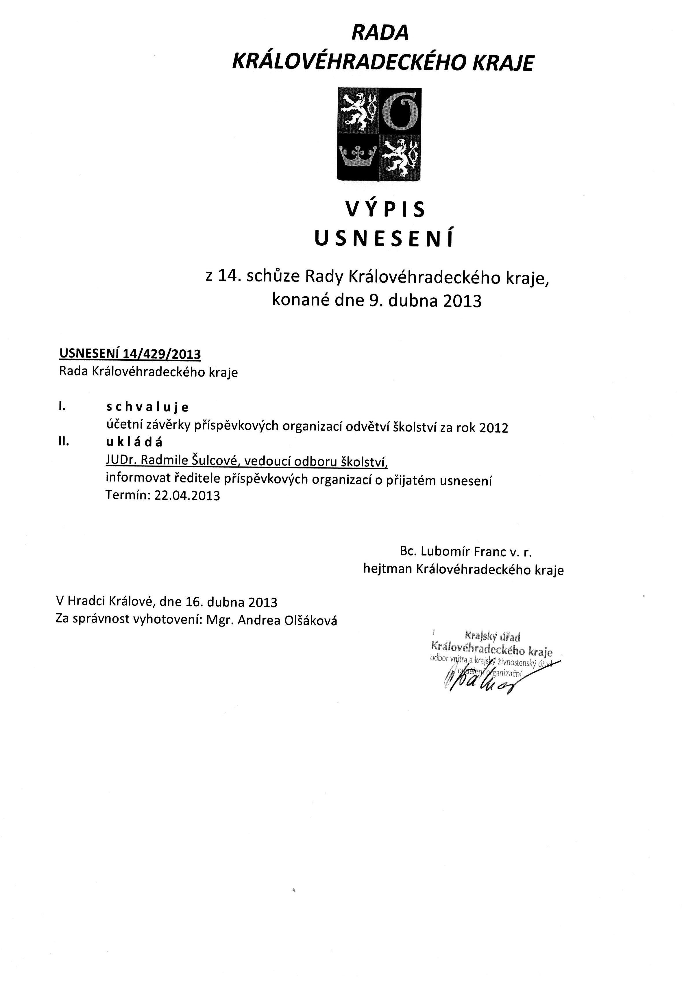 Usnesením Rady Královéhradeckého kraje RK/14/429/2013 ze dne 9. dubna 2013 (viz příloha) byly účetní závěrky škol a školských zařízení za rok 2012 schváleny.