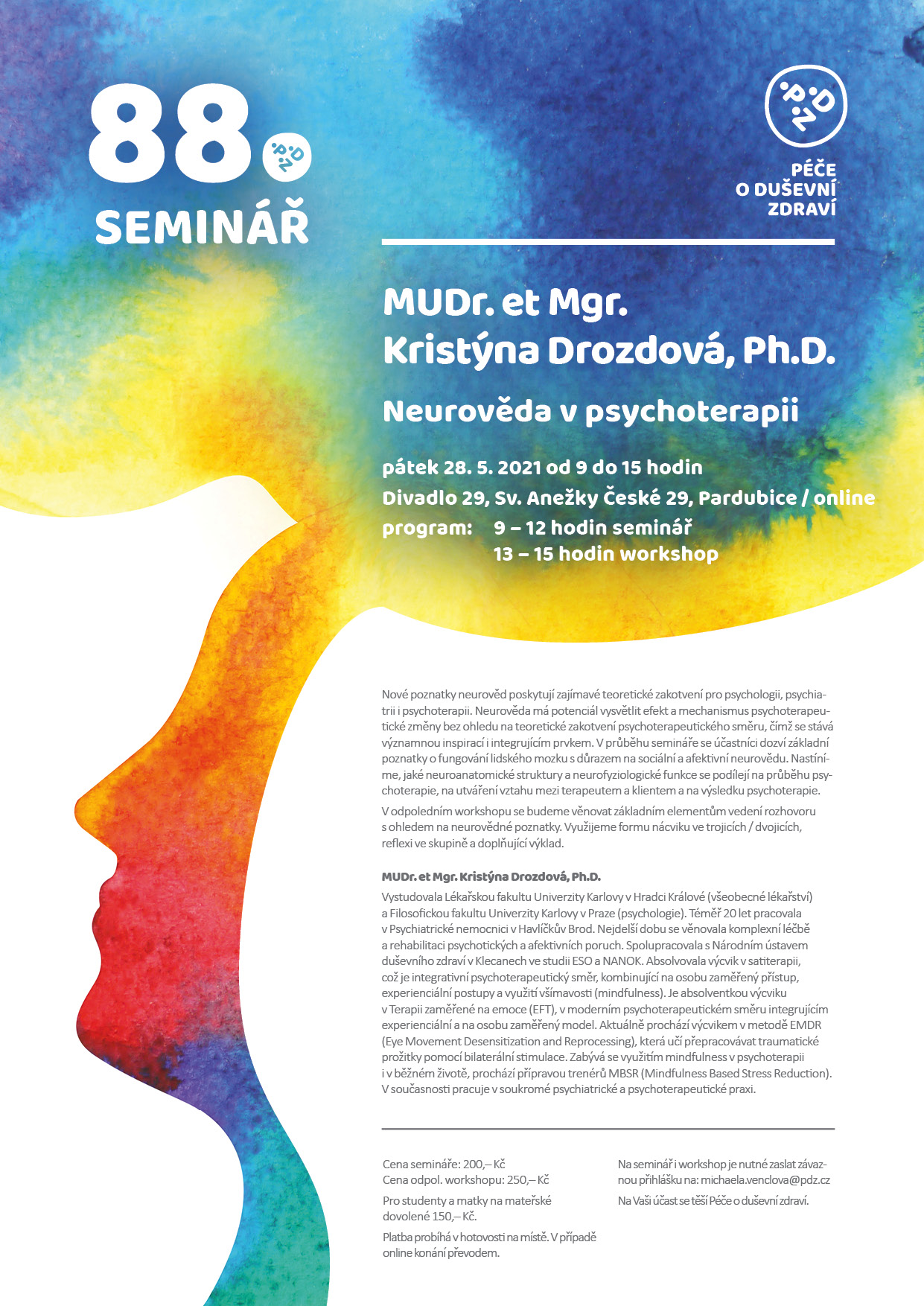 Rádi bychom Vás pozvali na tradiční Seminář Péče o duševní zdraví. Seminář na téma Neurověda v psychoterapii, který bude lektorovat MUDr. et Mgr. Kristýna Drozdová, Ph.D., se uskuteční 28. 5. 2021 v Divadle 29 v Pardubicích od 9 hodin. V případě nepříznivé epidemiologické situace se seminář uskuteční online.
