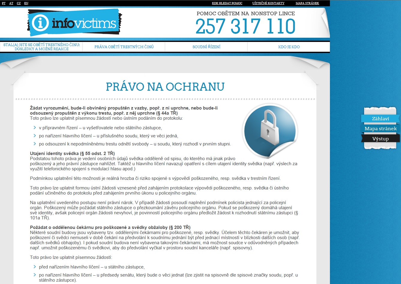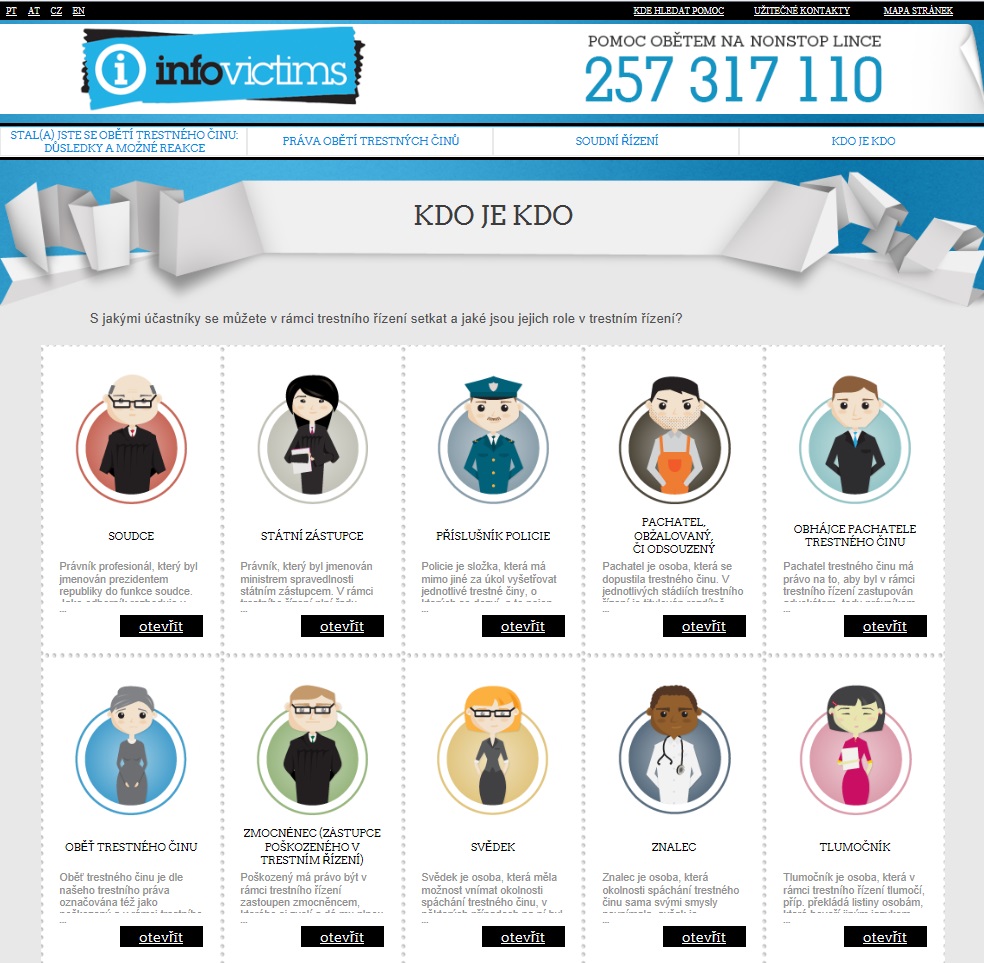 Velkou naději na posílení důvěry a ochoty oznamovat trestné činy nabídl zákon o obětech trestných činů, který je v České republice účinný od 1. srpna 2013. Jelikož je pro běžnou populaci, stejně jako téměř každá nová právní norma, i tento zákon náročný z hlediska srozumitelnosti a jeho aplikace v praxi, rozhodl se Bílý kruh bezpečí u příležitosti letošního Evropského dne obětí (22. února) zpřístupnit na internetu obsáhlé a srozumitelně formulované informace pro oběti a svědky trestných činů. Občan zde nalezne informace počínaje oznámením trestného činu, právem na ochranu, soukromí, peněžitou pomoc , hlavní líčení u soudu, postavení jednotlivých osob aj. Tyto stránky Bílý kruh připravil v rámci mezinárodního projektu INFOVICTIM a jsou dostupné prostřednictvím www.bkb cz kliknutím na „rady pro oběti“.