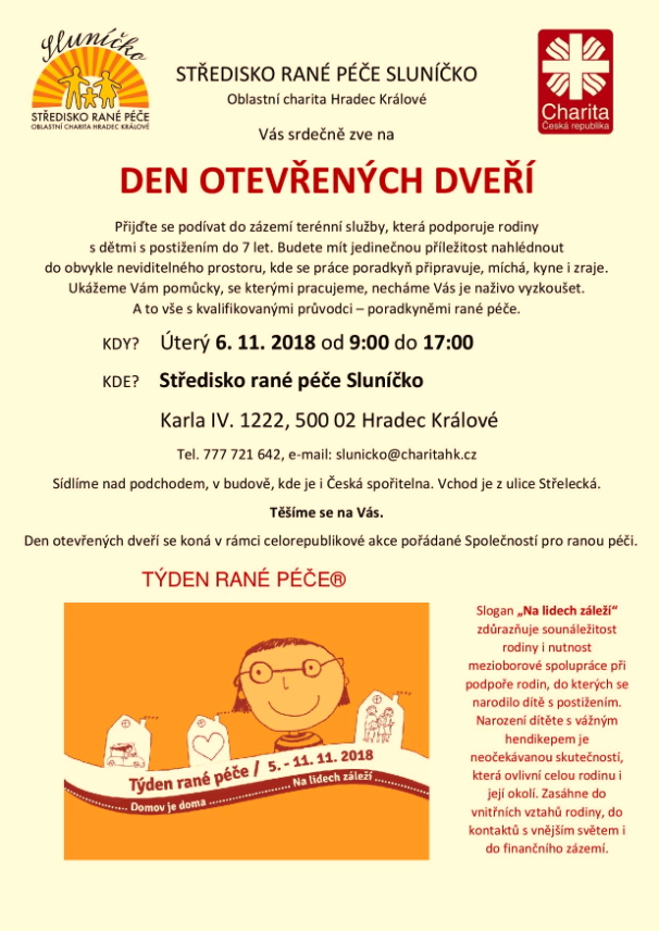 Středisko rané péče Sluníčko zve na v úterý 6. listopadu (9 – 17 hodin) na Den otevřených dveří.