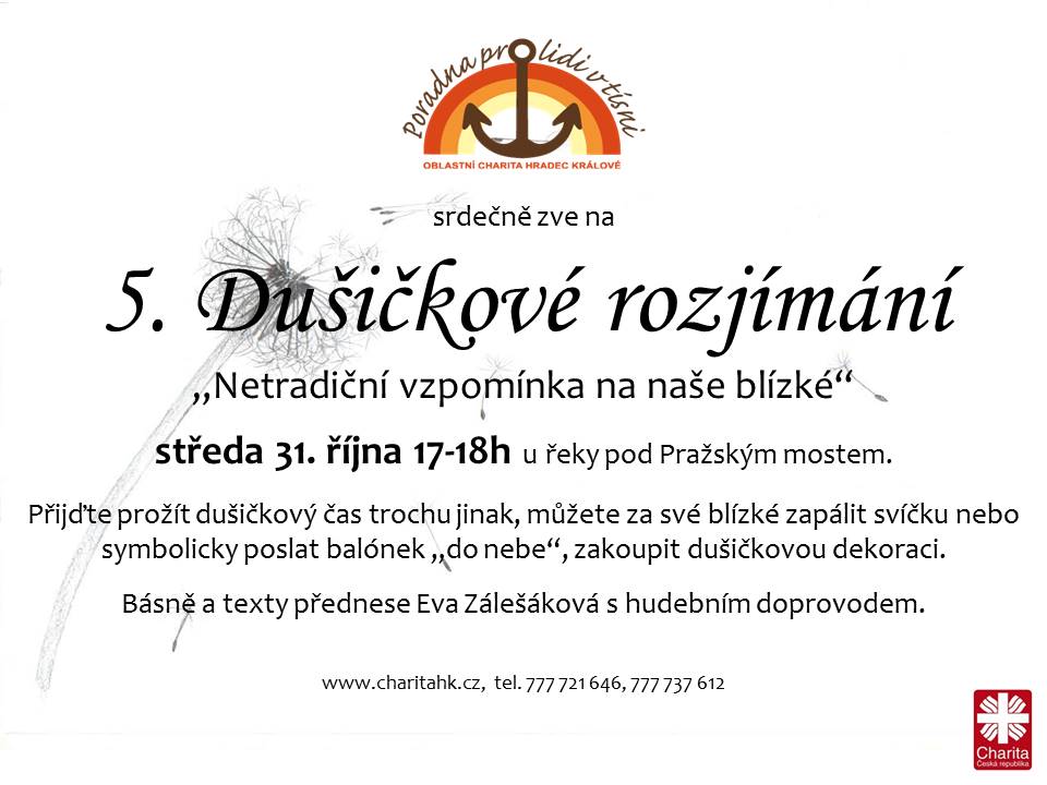 Přijďte prožít dušičkový čas trochu jinak, můžete za své blízké zapálit svíčku nebo symbolicky poslat balónek „do nebe“, zakoupit dušičkovou dekoraci. Básně a texty přednese Eva Zálešáková s hudebním doprovodem. Pohoštění zajištěno. www.charitahk.cz