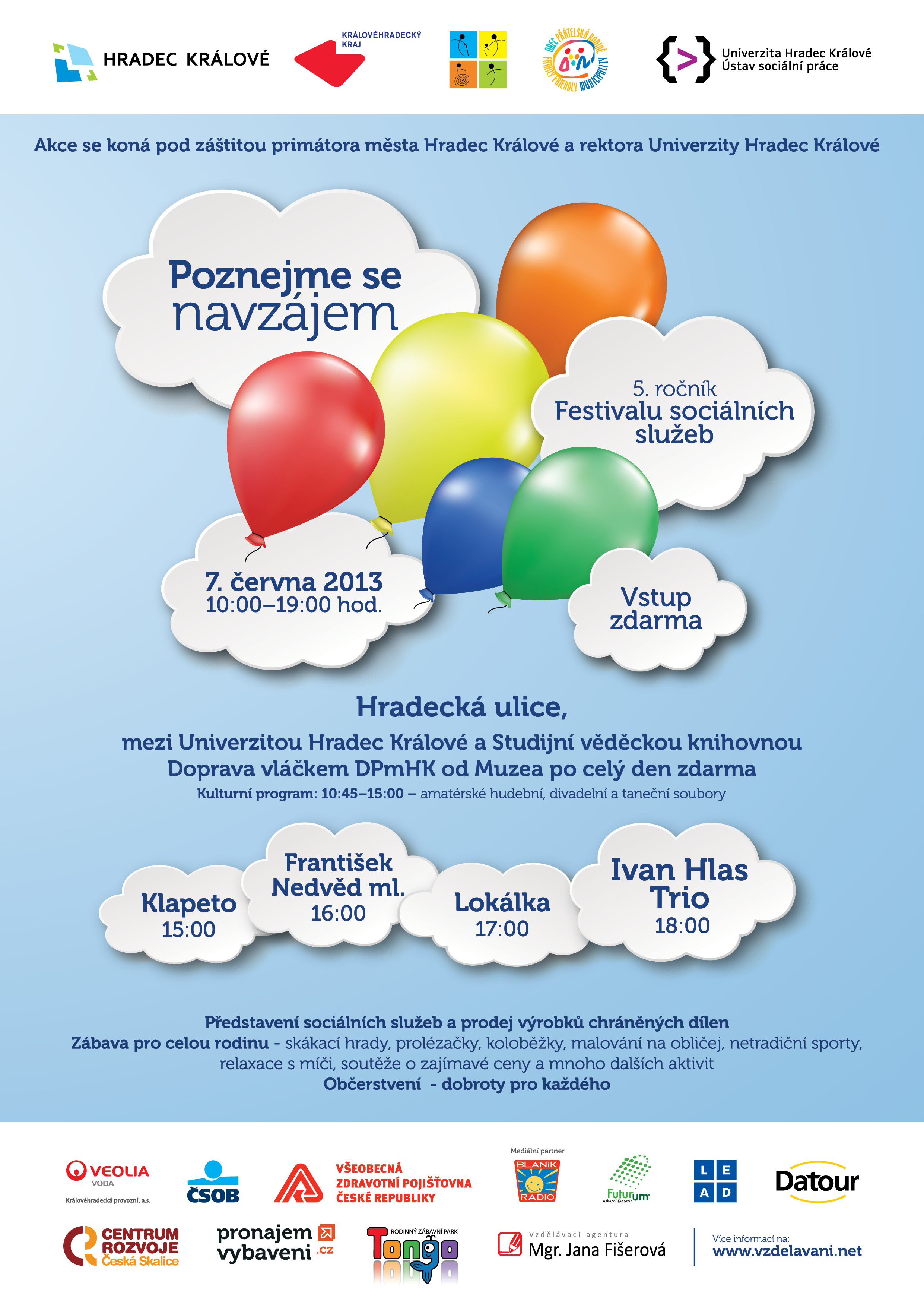 Poznejme se navzájem je název již pátého ročníku Festivalu sociálních služeb, který se bude konat v pátek 7. 6. 2013 od 10.00 do 19.00 v prostorách mezi Univerzitou Hradec Králové a Studijní vědeckou knihovnou v Hradecké ulici. Akce je realizována za finanční podpory Statutárního města Hradec Králové a koná se pod záštitou primátora města Hradec Králové MUDr. Zdeňka Finka a rektora Univerzity Hradec Králové prof. RNDr. Josefa Hynka, MBA, Ph.D. Smyslem Festivalu sociálních služeb je zvýšit povědomí široké veřejnosti o poskytovaných sociálních službách ve městě Hradec Králové. Vstupné je pro všechny návštěvníky zdarma.