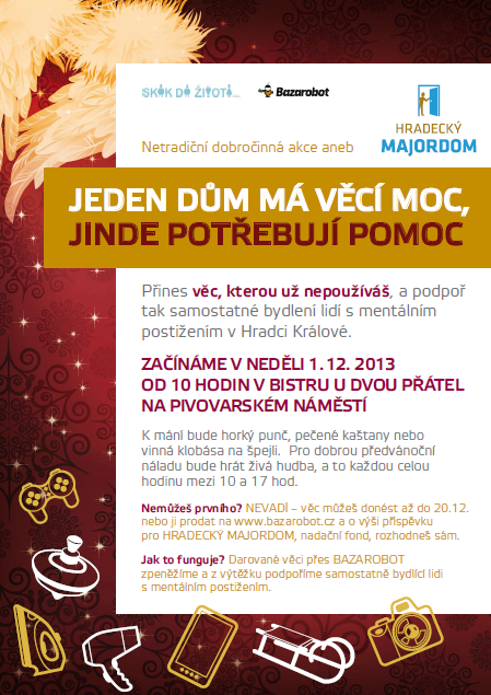 Nadační fond Hradecký Majordom pořádá netradiční dobročinnou akci. Začíná v neděli 1. 12. 2013 od 10 hodin v Bistru u Dvou přátel na Pivovarském náměstí v Hradci Králové. Přineste věci, které už nepoužíváte, a podpořte tak samostatné bydlení lidí s mentálním postižením v Hradci Králové