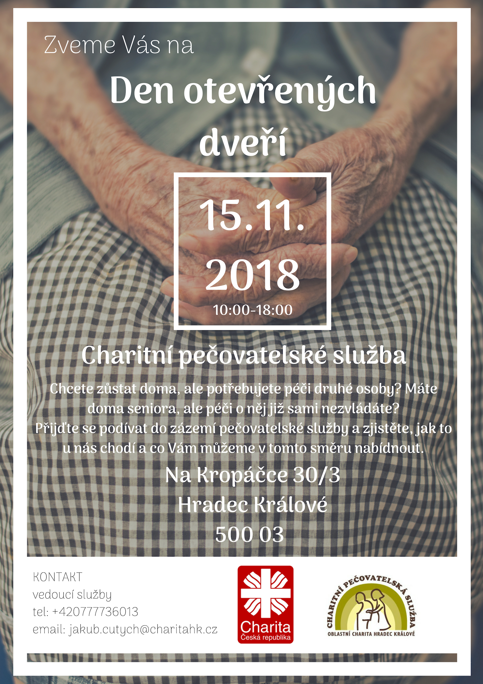 Přijďte se poradit, jak vám mohou být pečovatelé a pečovatelky nápomocní v činnostech od ranního vstávání až po uložení k večernímu odpočinku. Poradíme vám, pomůžeme, domluvíme vše tak, aby vám péče vyhovovala. Den otevřených dveří se koná 15. listopadu v čase 10 - 18 hodin, Na Kropáčce 30/ 3, Hradec Králové. www.charitahk.cz